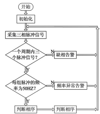 檢測電路得到的脈沖電壓信號送至Atmega16單片機(jī)進(jìn)行處理,單片機(jī)的程序通過C 語言編制, 主程序流程如圖7 所示, 主要分為三個(gè)模塊: 缺相判定, 頻率正常判定和相序判定, 系統(tǒng)正常工作后,三個(gè)模塊循環(huán)執(zhí)行。