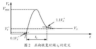由整流二極管的國際標準知,正向恢復時間tfr 規定為:在緊接零電壓或其他規定的反向電壓條件施加規定的階躍正向電流時,正向電壓上升到第一個規定值瞬間和從其峰值VFRM 下降到接近正向電壓最終穩定值的第二個規定值瞬間的時間間隔。如圖2 所示。