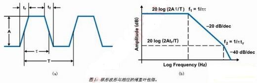 對于CCM中運作的降壓轉換器,電感電流一直是非零的正電流。在這種情況下,負載周期為D=Vout/Vin,在本例中為38%(5V/14V)。使用200kHz的開關頻率時,我們很快計算出導通時間為1.8μs。為支持此頻率,控制開關的上升/下降時間必須小于90納秒。這使得我們注意到第一個減少噪聲的方法,也就是斜率控制。您可能還無法理解,但是此時我們非常了解與PWM切換節點有關的諧波,也就是開關穩壓器的控制波形。如果將此波形以圖1(a)中所示的梯形表示,波形的諧波便能夠以圖1(b)中的內容表示,這表明了EMI背后的驅動因素。這一傅里葉包絡定義了可通過傅里葉分析或計算梯形波形導通時間及上升時間取得的諧波振幅。