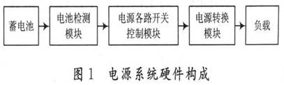 本電源系統(tǒng)各部分主要實(shí)現(xiàn)的功能如下:供電電源由2塊12 V的鉛酸蓄電池串聯(lián)而成,為系統(tǒng)提供24 V的直流電壓;電池檢測(cè)模塊主要是通過對(duì)供電電源的輸出電壓進(jìn)行取樣,以獲取蓄電池的電量消耗信息,實(shí)時(shí)對(duì)電池充電以保證整個(gè)系統(tǒng)正常穩(wěn)定的工作;電源各路開關(guān)控制模塊主要是根據(jù)系統(tǒng)負(fù)載的工作狀態(tài),通過開關(guān)控制決定是否為該負(fù)載供電,以此來降低待機(jī)功耗,延長電池的使用時(shí)間;電源變換模塊主要用模塊DC-DC轉(zhuǎn)換器作為構(gòu)建單元實(shí)現(xiàn)電源電壓的轉(zhuǎn)換為負(fù)載提供合適的電壓。