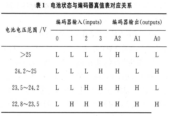 編碼器74HCl48低電平有效,所以在比較器LMl39的后面又接了反相器74HC04,編碼器輸入/輸出的二進(jìn)制碼(真值表)與電池電壓的關(guān)系如表1所示。