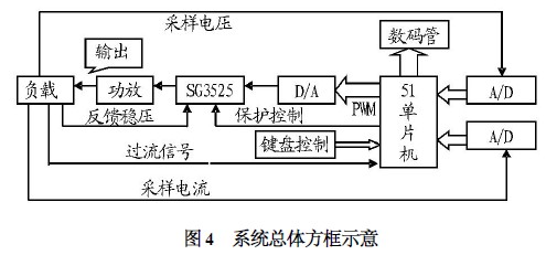 (2) 軟件實現自動保護控制。在負載端采樣電壓,通過單片機來查詢負載電平的高低控制SG3525 芯片的shutdown 端口來控制輸出,從而達到保護的目的。該方法簡單,且為后續智能化過載保護的實現提供基礎。通過對該電源電路進行方案論證,該系統的原理圖如圖4 所示。