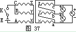 測單相變壓器時,如圖36所示,在初級線圈一側拉入一個1.5伏的干電池,然后在次級線圈拉入一直流毫伏表。當合上開關K的一瞬間,表針朝正方向擺動(或拉開開關時表針向負方向擺),說明接電池正極一端是同極性,或叫同名端。測試三相變壓器的極性和級別,多采用直流法進行。測試方法為:在初級線圈側接上干電池和開關K,先在A端接電池正極,B端接電池負極,再在次級線圈a、b、c之間拉入三個毫伏表,如圖37所示,