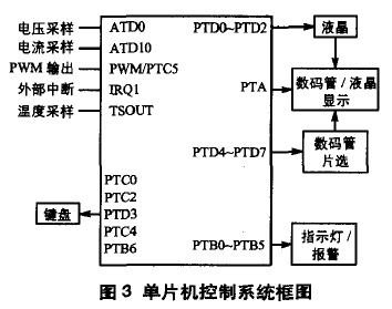 單片機采用Freescale公司的68HC908SR12,其內部資源豐富,集成了12k的程序存儲器,2路定時/計數器,14通道1o位A/D轉換器,PWM輸出,內部溫度傳感器等。單片機控制系統框圖如圖3。