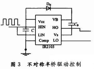 不對稱半橋驅(qū)動電路,如圖3所示。驅(qū)動集成芯片采用IR公司的IR2103,其輸出級作為推挽驅(qū)動輸出,以直接耦合的方式與主電路的開關(guān)管相連接,由HO和LO的輸出分別作為驅(qū)動橋式電路的上、下橋臂。為了實(shí)現(xiàn)上橋臂驅(qū)動電路的地電位與主電路的同步浮動,采用由DB和CB組成的外接自舉電路。