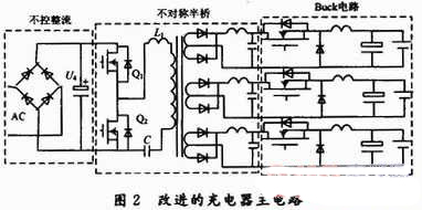 改進(jìn)的新型充電器主電路,如圖2所示。前級采用軟開關(guān)不對稱半橋?qū)崿F(xiàn)了多路的隔離輸出,并且利用自身產(chǎn)生的寄生參數(shù),實(shí)現(xiàn)諧振式零電壓軟開關(guān)以此減小開關(guān)的損耗,同時也避免了因變壓器漏感而帶來的電壓尖峰。后級采用成熟簡單的Buck電路拓?fù)洌瑢?shí)現(xiàn)降壓并用此來滿足三段式充電的要求。