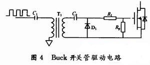 當(dāng)驅(qū)動門極的輸出為高電平時,隔離變壓器驅(qū)動側(cè)電容能夠防止直流分量流過變壓器的初級,而另一側(cè)電容和二極管能夠把電壓變?yōu)閱螛O性。同時兩個電容的取值至少是MOSFET器件本身的門極電容的10倍。