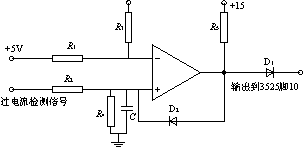 過電流保護采用電流互感器作為電流檢測元件,其具有足夠快的響應速度,能夠在IGBT允許的過流時間內將其關斷,起到保護作用。如圖1所示,過流保護信號取自CT2,經分壓、濾波后加至電壓比較器的同相輸入端,如圖4所示。當同相輸入端過電流檢測信號比反相輸入端參考電平高時,比較器輸出高電平,使D2從原來的反向偏置狀態轉變為正向導通,并把同相端電位提升為高電平,使電壓比較器一直穩定輸出高電平。同時,該過電流信號還送到SG3525的腳10。當SG3525的腳10為高電平時,其腳11及腳14上輸出的脈寬調制脈沖就會立即消失而成為零。