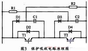 由于電路中分布電感的存在,加之IGBT開關速度較高,當IGBT關斷時及與之并接的反向恢復二極管逆相恢復時,會產生很大的浪涌電壓Ldi/dt,從而威脅IGBT的安全。因此必須采取措施抑制浪涌電壓,保護IGBT不被損壞。可以采用加裝保護吸收電路的辦法來抑制浪涌電壓。其原理圖如圖3所示,該保護吸收電路有良好的抑制效果,具有保護吸收中發生損耗小的優點。