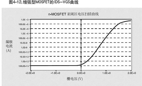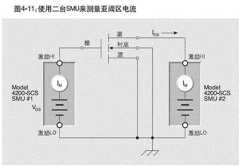 亞閾區(qū)電流測試常常在晶圓片級進行。它是表示器件打開和關(guān)閉的快慢程度的參數(shù)。圖4-11示出測量亞閾區(qū)電流的典型測試設(shè)置情況。在此配置中,4200型半導(dǎo)體特性分析系統(tǒng)配備了2個SMU和前置放大器。使用一個SMU來提供恒定的漏-源電壓(VDS),并測量產(chǎn)生的漏極電流(IDS)。另一個SMU用來掃描柵-源電壓(VGS)。對這個SMU來說,應(yīng)當(dāng)將鉗位電流或測量電流值設(shè)置為固定測量量程上的最高期望的柵極電流。