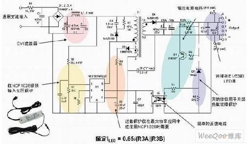圖1:安森美半導體離線式第二代LED驅動器NCP1014/1028的應用示意圖。