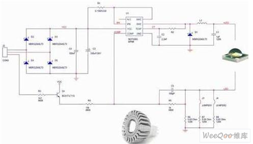 另一方面,如上所述,在不需要隔離的應用中,可以采用較為簡單的降壓拓撲結構,這種結構所使用的電感比變壓器小得多,而且只需要很少的元件來實現(xiàn)這種解決方案。這種架構采用的是峰值電流控制(PCC)模式,工作在深度連續(xù)導電模式(CCM)。這種架構具有多種優(yōu)勢,如可以消除使用大電解輸出電容、具有“良好”穩(wěn)流的簡單控制原理,以及能夠充分利用安森美半導體的動態(tài)自供電(DSS)技術能力來直接從交流線路為驅動器供電。圖3顯示的是安森美半導體NCP1216 PWM電流模式控制器的應用設計示意圖。