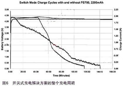 利用開關(guān)式充電解決方案的整個充電周期如圖6所示。通過在充電系統(tǒng)中采用電池監(jiān)控器,可以大大縮短充電周期,使用電池監(jiān)控器就不必再檢測電池包保護電路兩端的電壓以及充電電流的接觸電阻。