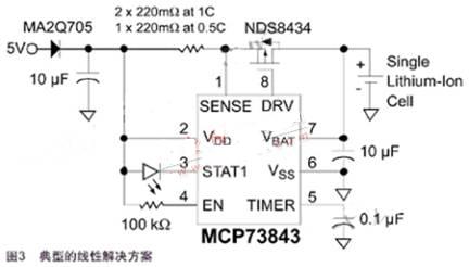基于Microchip MCP73861的全集成線性解決方案如圖4所示。MCP73861包含了MCP73843的所有功能,另外還包括電流檢測、傳輸晶體管、反向放電保護以及電池溫度監(jiān)測。