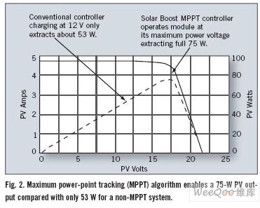但采用MPPT算法后,情況發(fā)生了根本變化。在本例中,模塊能實現(xiàn)最大輸出功率的電壓是17V。因此,MPPT算法的職責(zé)是使模塊工作在17V,這樣一來,無論電池電壓是多少,都能從模塊獲取全部75W的功率。