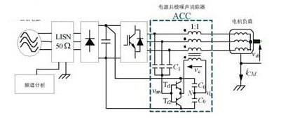 傳統(tǒng)的用于消除共模電壓的有源濾波器如圖8所示,文獻(xiàn)將其稱為有源共模噪聲消除器,acc連接在逆變器的輸出端和三根電纜之間,由共模電壓傳感器、補(bǔ)償電路和共模變壓器組成,acc在逆變器輸出端疊加一個(gè)補(bǔ)償電壓,該補(bǔ)償電壓與pwm逆變器產(chǎn)生的共模電壓極性相反、幅值相等,從而使施加在負(fù)載上的共模電壓被完全消除,也就減小了共模電流和傳導(dǎo)emi。