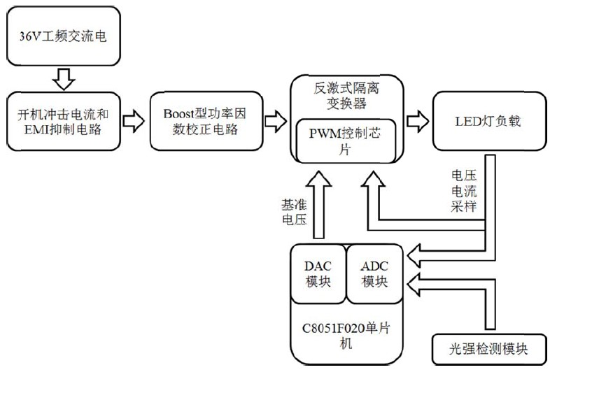220VAC經(jīng)工頻變壓器降壓為36VAC,經(jīng)開機(jī)沖擊電流抑制電路輸入到功率因數(shù)校正電路中,再經(jīng)高頻隔離變壓器給串聯(lián)在一起的LED燈供電,在LED燈處分別進(jìn)行電壓、電流采樣,返回給PWM控制芯片和單片機(jī),由單片機(jī)給定基準(zhǔn)電壓來控制PWM控制芯片,進(jìn)而達(dá)到控制LED燈恒流可調(diào)的目的。系統(tǒng)總體結(jié)構(gòu)框圖如圖1所示。
