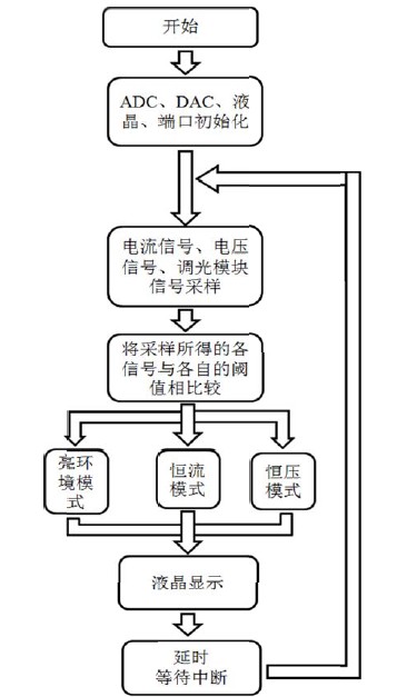 由于本LED 恒流電源工作時(shí)絕大部分時(shí)間處于穩(wěn)定狀態(tài),且對(duì)反應(yīng)速度沒有過快要求,因此并不需要對(duì)電壓、電流信號(hào)進(jìn)行同時(shí)的采樣,而可以分別采樣,模式切換和基準(zhǔn)電壓的調(diào)整也不需在中斷服務(wù)中完成,只有步進(jìn)調(diào)整電流的按鍵程序需要在中斷服務(wù)中完成。