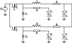 式中:Vc1、Vc2分別為C1和C2上電壓的平均值;IL1、IL2分別是L-和L2流過電流的平均值,亦即兩路輸出電流平均值;R1及R2是濾波電感的等效串聯(lián)電阻,當(dāng)在工藝上設(shè)計(jì)并聯(lián)電源每路輸出電感基本上一樣時(shí),可以認(rèn)為R1=R2。因此,要控制兩路電流均流,即要求IL1=IL2,于是,只要控制Vc1=Vc2就行了。所以,電容C1及C2上的電壓Vc1和Vc2可以代表兩路電流IL1及IL2大小,可用來進(jìn)行均流控制。