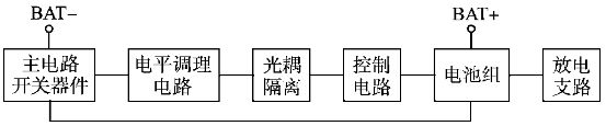 當電池組放電時,外接負載分別接電池組正負極BAT+和BAT-兩端,放電電流流經(jīng)電池組負極BAT-、充電控制開關(guān)器件、放電控制開關(guān)器件、電池組中單節(jié)鋰電池N~1和電池組正極BAT+,電流流向如圖4所示。系統(tǒng)中控制電路部分單節(jié)鋰電池保護芯片的放電欠電壓保護、過流和短路保護控制信號經(jīng)光耦隔離后串聯(lián)輸出,為主電路中放電開關(guān)器件的導通提供柵極電壓;一旦電池組在放電過程中遇到單節(jié)鋰電池欠電壓或者過流和短路等特殊情況,對應(yīng)的單節(jié)鋰電池放電保護控制信號變低,無法為主電路中的放電控制開關(guān)器件提供柵極偏壓,使其關(guān)斷,主回路斷開,即結(jié)束放電使用過程。