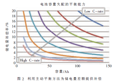 主動平衡系統的性能取決于平衡電流與電池充電和放電率之間的比率。電池的不平衡率越高而且充電或放電率越大,所需的平衡電流便越高。主動式電池管理系統可以在充電或放電時為小電池之間的儲電量差額提供補償(假設采用的平衡電流恒定不變),圖2顯示這個差額的補償數值。
