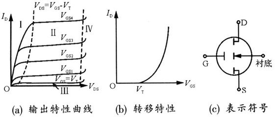 圖2 N溝道增強(qiáng)型絕緣柵場效應(yīng)管的特性曲線和表示符號[page]