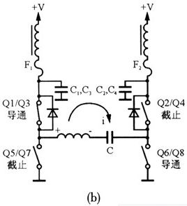 因?yàn)樵谟玫墓Ψ拍K產(chǎn)生的射頻電流必須流過合成變壓器的次級,并在已關(guān)斷的射頻功放模塊的初級繞組上感應(yīng)出射頻電壓。根據(jù)楞次定律,變壓器次級電流所產(chǎn)生的磁通總是試圖抵消初級電流所產(chǎn)生的磁通,所以,流過關(guān)斷功放輸出變壓器次級的電流感應(yīng)到初級的電壓后,一定和原來的輸出電壓極性相反。在如圖6(a)所示,由次級電流感應(yīng)到初級的電壓為左正右負(fù),說明關(guān)斷的射頻功放在導(dǎo)通狀態(tài)下的變壓器初級電壓極性是左負(fù)右正,與此相對應(yīng)的導(dǎo)通管為Q2/Q4,截止管為01/Q3,從而形成的低阻抗通路為:與Ql/Q3相并聯(lián)的反向二極管→旁路電容C1、C3→旁路電容C2、C4→Q2/Q4→隔直電容C。同理,圖6(b)所形成的低阻抗通路為:與Q2/Q4相并聯(lián)的反向二極管→旁路電容C2、C4→旁路電容C1、C3→Q1/Q3。