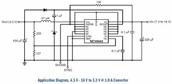 在降壓開關驅動器方面,包括NCV8842、NCV8843及NCV51411等產品,適合于車身/遠程信息系統等應用。NCV8842/3是帶同步功能的1.5 A、170/340 kHz降壓驅動器,支持4.5 V至40 V輸入電壓,而輸出電壓可從1.27 V開始編程設定。同步引腳功能用于改善EMI性能。