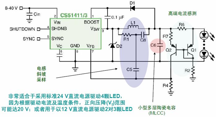 圖7:基于CS51411/3的260/520KHz集成PWM降壓轉換器