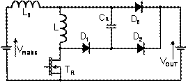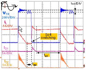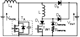 從理論上講,因?yàn)樗械拈_(kāi)關(guān)損耗都被消除,零壓轉(zhuǎn)換(ZVT)是功率因數(shù)校正(PFC)應(yīng)用最理想的拓?fù)洹4送猓还茌斎牒洼敵龉β嗜绾巫兓@種電路都能正常工作。然而,在實(shí)際應(yīng)用中,升壓二極管DB的反向恢復(fù)電流對(duì)零壓轉(zhuǎn)換電路的影響非常明顯,致使電感和最小占空比都受到一定程度的限制。因?yàn)樾【€圈L上的重置電流,D2 的反向恢復(fù)電流包含高應(yīng)力電壓和寄生阻尼振蕩。最后,PN二極管的動(dòng)態(tài)特性影響零壓轉(zhuǎn)換(ZVT)電路的總體能效,因?yàn)檫@個(gè)晶體管的導(dǎo)通時(shí)間應(yīng)該增加,而且為降低半導(dǎo)體器件遭受的電應(yīng)力,必須增加一個(gè)有損緩沖器。