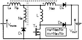 這個(gè)創(chuàng)新的電路是按照軟開(kāi)關(guān)標(biāo)準(zhǔn)設(shè)計(jì)的,如圖4所示,為恢復(fù)小線圈L貯存的電能,在升壓線圈LB 附近新增兩個(gè)二極管 D1和D2 和兩個(gè)輔助線圈NS1和NS2 。
