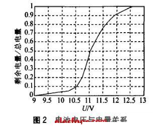 系統(tǒng)工作時(shí)間與電池電量成線性關(guān)系, 而電量與電池端電壓為非線性關(guān)系。圖2 所示為本系統(tǒng)所用電池在2 000 mA 恒流放電的情況下, 電池端電壓與電量的關(guān)系曲線, 其中橫軸為電池電壓, 縱軸為剩余電量相對(duì)于總電量的百分比。根據(jù)此曲線, 在MCU 軟件中擬合一個(gè)電壓與電量關(guān)系的數(shù)據(jù)表, 同時(shí)設(shè)置10 V為告警電壓; 系統(tǒng)可以實(shí)時(shí)查詢諸如電池電壓、電流、剩余電量、估計(jì)供電時(shí)間等信息, 并同時(shí)仿手機(jī)做成3段式顯示, 使上位機(jī)全面掌握電池狀態(tài),決定控制策略, 從而提高系統(tǒng)運(yùn)行可靠性。MCU 軟件使用KeiluV2 軟件開(kāi)發(fā), 上位機(jī)軟件使用LabWindow s 軟件開(kāi)發(fā)。MCU 除完成電量查詢相關(guān)功能, 還要完成報(bào)警與顯示功能; 上位機(jī)軟件同時(shí)要完成環(huán)境參數(shù)的相關(guān)采集與處理。