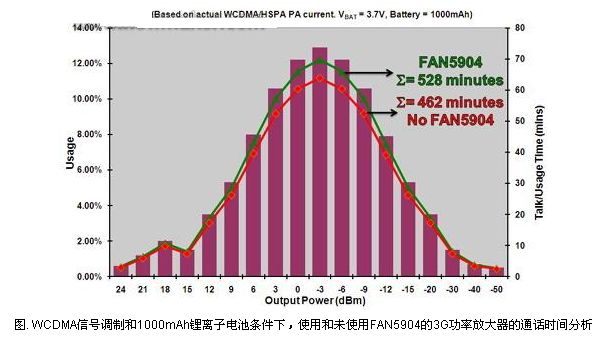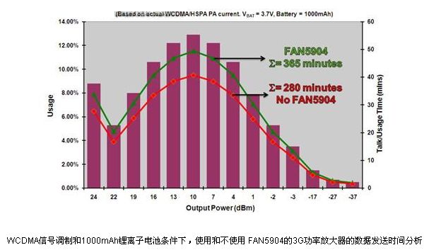 圖1和圖2顯示了在不同輸出功率條件下一個3G PA分別在語音和數據傳輸模式下有、無FAN5904時所使用的工作時間的分析。在PA電源電壓設定在鄰近信道功率比(ACPR)為-39dBc時的值時, WCDMA的ACPR可以改善到-43dBc,但是電流消耗將會增加,導致效率降低。