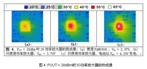 一個時常被忽視,但經常遭到抱怨的參數是耗熱問題。在手持電話貼近頭部進行通話,使用手機網上沖浪或者玩在線網絡游戲時手機發熱,大多數用戶會因此而感到煩惱。問題的關鍵在于,設計人員在設計手機時必需將這一因素考慮在內。圖4所示為某3G功率放大器的熱成像,其中,(a)為使用FAN5904來供電;(b)為直接與電池連接;(c)為電池以4.2V電壓充電。使用FAN5904時,在滿輸出功率情況下,功率放大器的溫度幾乎不可能達到50?C,在(b)和(c)的情況下,溫度很容易達到50?C和65?C,使用一段時間后,手機會很快發熱。在數據卡應用中,尤其是3G USB調制解調器卡開始流行,熱耗散,或者說實現熱耗散最小化變得十分重要。USB卡不能像手機那樣有效地散熱,因為它的體積非常小。由于3G調制解調器主要用于數據,功率放大器在大部分時間運行于“發熱”狀態。減少這種熱量的最有效方式是使用諸如FAN5904的降壓轉換器。