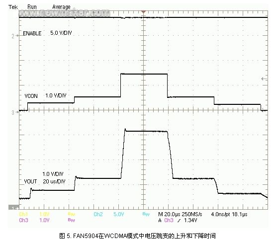 在輸出功率需要從低水平變到高水平,或者從啟動開始,瞬態響應時間為10?s。對于降壓穩壓器而言,關鍵是使功率放大器滿足這些規范要求,避免出現通話中斷或者通話語音質量不良的情況。由于用戶在不同的區域移動,信號覆蓋情況或好或壞,雖然如此,通話中斷現象是用戶所不能容忍的。對于GSM/EDGE模式,FAN5904能夠在5?s內完成電壓之間的跳變,滿足GSM規范。圖6所示為用于WCDMA和GSM /EDGE發送器的FAN5904時序圖。