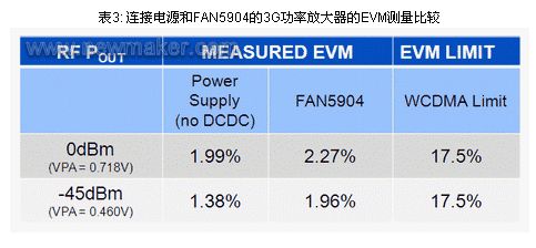 表3列出了所測量的0dBm 和-45dBm (圖8中VPA 值接近VOUT_DCDC )輸出功率的EVM,比較使用電源和FAN5904為3G功率放大器供電的情況。兩列數值之間的差異很小,這清楚表明信號保真度的變化不大,不會影響RF 性能,遠在WCDMA極限數值之下。