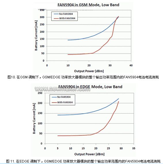 最后一個重要特性是,FAN5904控制GSM/EDGE功率放大器模塊的能力在于將RF功率管理解決方案從 FAN5904分離出來。在GSM/EDGE模式下,FAN5904具有3A的設計峰值極限電流,因而能夠控制電流高達2A的功率放大器模塊。在GSM /EDGE模式下,由于電流負載更大,FAN5904總是以PWM方式工作,因為GSM和EDGE信號較3G信號具有更高的輸出功率水平,因此它以 3MHz的頻率進行開關。3MHz是合適的開關頻率,因為它位于WCDMA通道帶寬之外,但是仍然可以使用小電感和小電容來處理更大電流負載,并使效率維持在高達95%的水平。人們可能要問,為什么在該模式下不使用6MHz,這在設計上是不可行的,因為較大的電流負載會使開關損耗更高,小型化解決方案帶來的好處在效率方面得不到補償。圖10和圖11顯示,在蜂窩設備處于GSM或EDGE模式下,使用FAN5904可將電流降低100mA。