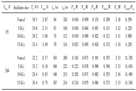 從表2中可以看出, 在85 V 交流輸入電壓下,輻照之后的APT13003E 比未輻照的APT13003E 的關(guān)斷延時(shí)有了大幅的減小, 因此關(guān)斷損耗大幅的減小, 如輻照為10 kGy的管子的關(guān)斷損耗減小為未輻照管子的1 /6; 導(dǎo)通延時(shí)有所增加, 但增加的幅度較小, 導(dǎo)通損耗有較小的增加; 飽和壓降隨輻照劑量的增加而增加, 因此通態(tài)損耗隨輻照劑量的增加而增加。開通損耗、通態(tài)損耗的增加與關(guān)斷損耗的減小是一對(duì)矛盾, 因此必須選擇合適的輻照劑量, 才能使開關(guān)晶體管總的損耗最小。