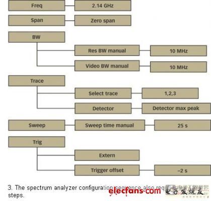 正如已經提到的一樣,頻譜分析器在“零檔”模式下使用。不論是分辨率帶寬還是視頻帶寬,均設為10MHz,因為頻譜分析器被用來測量峰值功率。基于同樣的理由,檢測器必須在“最大峰值”模式下設置。選取25s的掃描時間以便獲得對屏幕的整體掃描。選擇外部觸發器的可選項。利用“觸發器偏差”特性將屏幕上的軌跡置于中心也是一種明智的選擇。-2s即是合適的。圖3顯示了詳細的配置序列。