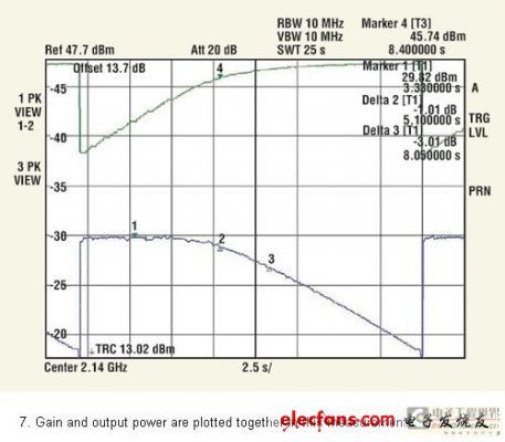 用于頻譜分析器的功能序列顯示在圖4中。此刻,頻譜分析器連接到輸入,且輸入功率在第二條線跡(線跡2)獲取,并保持在“觀察”模式。圖5中的黑色線跡即得。當在輸出再連接分析器之后,從第三條線跡(線跡3)獲得輸出功率,同樣也保持在“觀察”模式。通過設置“輸出偏差”值的參數等級偏差,該值在校準階段被設為43.7dB,從“線跡3”可以直接讀取以dBm為單位的絕對輸出功率,圖5中的綠線即得。通過在鋸齒末端的平面區域安置標記,可以讀取如圖5 中綠線所示的飽和功率。MW4IC2230MB顯示+47.23dBm的飽和功率。
