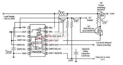 圖 6 顯示了電流與兩個電壓結(jié)點比較的電路。較低的電壓結(jié)點激活警報輸出,我們可為其配置一個適當(dāng)?shù)难舆t電路,以避免錯誤的瞬態(tài)觸發(fā)。較低的電壓結(jié)點在比較器輸入端內(nèi)置閾值為 0.6V。Q1 為較高電壓結(jié)點輸出提供緩沖,通過電源開關(guān) MOSFET 關(guān)閉電源,如果電流超過上限則啟用 Q2。較高電壓結(jié)點采用 INA206 的 1.2V 參考電壓,INA206 具有避免在沒有鎖存功能的電壓結(jié)點發(fā)生振蕩的鎖存功能。
