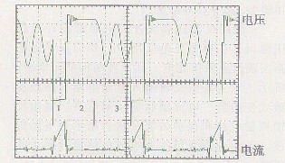 圖5所示的是工作在完全能量轉換狀態下, 開關管Q1上的電壓與電流波形。在這種工作模式下, 每個開關周期被分為三個階段( 分別如圖中1、2、3所示) .在階段1, 開關管導通, 變壓器原邊電流沿斜線上升到峰值電流, 并將能量儲存在高頻變壓器中。