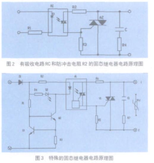 圖1、圖2 和圖3 三種電路都能實現(xiàn)固態(tài)繼電器的功能。圖1 是固態(tài)繼電器最簡單的電路原理圖,圖中A1 是交流光耦,A 2 是雙向可控硅。常用在小型的S S R ,使用時,用戶往往在外面增加器件來改善性能。圖2 是在圖1 的基礎(chǔ)上增加了RC 吸收電路和防沖擊電阻R2 。R 2是保護光耦,抑制在導通瞬間流過光耦的沖擊電流。附加這些器件后,大大改善了SSR 的EMC 特性和浪涌對光耦的沖擊性能。因此該電路常用在可靠性較高的場合。圖3 是一種特殊的電路,常用在高可靠性和E M C 等級較高的SSR 設(shè)計中。圖中的二極管D1 可防止輸入反極性。由Q1、Q2、R1 及R3 組成恒流電路,保證當輸入電壓變化時,光耦A 1 的電流恒定。R C 電路C 1 、R 7 和R 6 的功能與圖2 的相同。該電路還增加了壓敏電阻R V 。R V不僅加強了S S R 的過壓保護能力,而且大大改善了其E M C 性能。