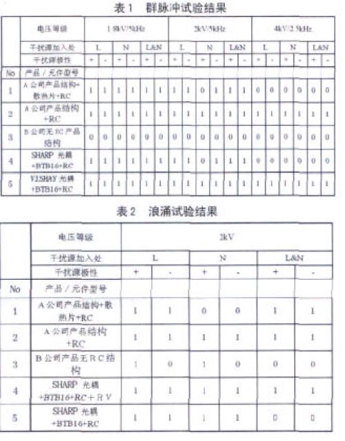 (4) 從試驗數(shù)據(jù)可以看出,在耐電脈沖群沖擊方面,光耦對繼電器的影響較大(見結(jié)論的第2 點),不同的光耦其耐沖擊性能不一樣;而在耐Surge 時,可控硅對繼電器的影響最大(較差的可控硅如dv/dt 太低等,將被擊穿);