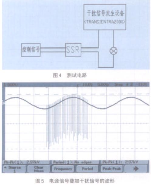 圖4 所示為測試電路。對SSR 來說,有信號源(穩(wěn)壓電源)、小于1 米的連線、負載及有關(guān)儀器;圖5 為電源信號疊加干擾信號的波形。