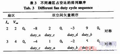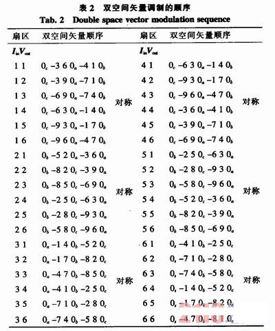 空間矢量調(diào)制法只確定開關(guān)間隔中應(yīng)用電壓矢量的占空比,從而獲得低頻率的輸出電壓和輸入電流的平均值,但是并沒有確定使用的順序。所以需要使用雙空間矢量調(diào)制法,同時(shí)也可改善波形的質(zhì)量。圖2表明了輸入電流在4扇區(qū),輸出電壓在5扇區(qū)應(yīng)用雙空間矢量調(diào)制的順序。電壓矢量在開關(guān)間隔中對(duì)稱分布,零矢量每4個(gè)開關(guān)間隔使用一次。在每次開關(guān)轉(zhuǎn)換中只有一個(gè)開關(guān)狀態(tài)發(fā)生改變以最大程度地降低損耗。在圖2中通過表格2確定相應(yīng)開關(guān)時(shí)間: