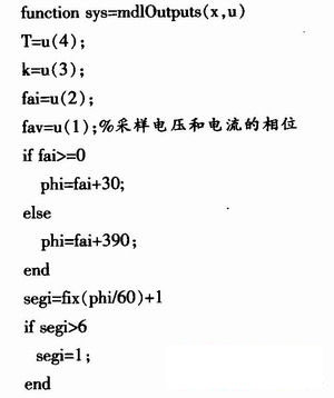 盡管現(xiàn)有的DSP技術(shù)和FPGA技術(shù)處理速度很快,很有效,但矩陣變換器的控制仍非常復(fù)雜,在仿真中,若按傳統(tǒng)方法使用定義好的Simulink模塊,會(huì)非常繁瑣,因?yàn)楸仨氄_的設(shè)置大量的參數(shù),而又沒有合適的調(diào)試工具。通過Matlab/Simulink里的功能強(qiáng)大的S函數(shù),S函數(shù)完美地結(jié)合了Simulink框圖簡(jiǎn)潔明快的特點(diǎn)和Matlab編程靈活方便的優(yōu)點(diǎn),可充分利用Matlab提供的豐富資源,調(diào)用各種工具箱函數(shù),實(shí)現(xiàn)模塊所無法實(shí)現(xiàn)的復(fù)雜功能,從而使問題大大簡(jiǎn)化。編程中既可以使用C語言,也可以使用Matlab語言來實(shí)現(xiàn)空間矢量調(diào)制法。使用后者會(huì)更簡(jiǎn)單些,以下是部分程序: