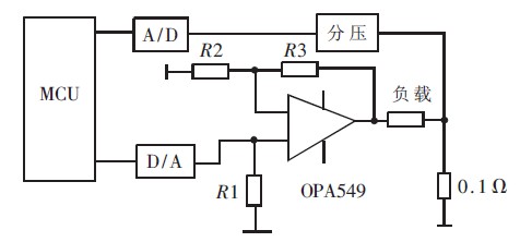 在該電源系統中, 主要為負載提供大電流, 采用PID 控制算法控制負載的發光強度。輸入為單片機經DAC輸出的控制電壓, 一路為比例放大電路, 如圖1 所示增益G=1+R3/R2.電流型DAC 通過R1 轉換成電壓, 控制OPA549 .輸出電流經采樣電阻轉換為采樣電壓, 送入A/D 轉換器反饋至單片機進行偏差值補償。