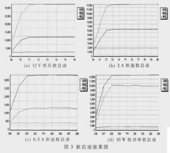 從圖3 的軟啟動效果圖可以看出, 在恒定電壓、電流、功率的模式下工作時, 系統開機過程超調量很小, 有效地控制了啟動過程, 防止了啟動過程產生過大的擾動電壓, 產生過大的功率, 有效地保護了負載。