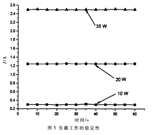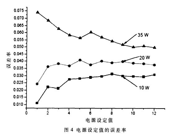 由于輸出電流達到8 A, 對電源的功率要求較高, 易產生噪聲, 這種隨機噪聲也會對輸出電流產生一定的影響。為減弱這種噪聲, 各個模塊分別供電, 以減少交叉干擾, 同時在電路板上多加裝去耦濾波電容, 減小干擾的影響, 同時OPA549 能有效地抑制紋波。影響電源穩定性的因素很多, 如負載的變化、取樣電阻的變化、A/D、D/A 的影響等。如圖4 所示, 不同負載的情況下, 電源誤差不同。10 W 的負載, 由于功率較低, 在電壓、電流增加時, 誤差變化也較小。35 W 的負載, 由于功率較大, 工作電流的變化范圍比較大, 功耗較大, 電源的誤差變化相應地也比較大。如圖5, 在10 W、20 W 和35 W 的負載時, 工作狀態穩定, 能夠滿足大電流、大功率的需要。